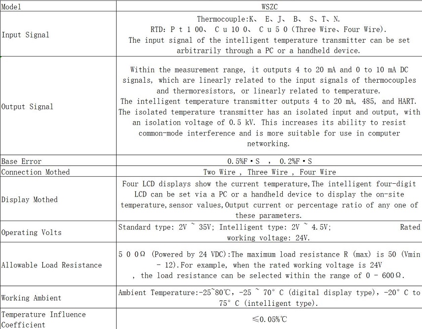 Az integrált hőmérsékleti adó egy hőmérsékleti transzducer modulból és ipari hőelemekből vagy termeszisztorokból áll. Két vezetékes, három vezetékes és négy vezetékes átviteli módszert alkalmaz. Az ipari hőelem- és ellenállási jeleket lineáris 4-20MA vagy 0-10MA kimeneti jelekké alakítja. Ez az adó közvetlenül telepíthető a hőelemek vagy a termeszisztorok csomópontjába, hogy integrált szerkezetet képezzen. A hőmérséklet -mérő eszköz új generációjaként széles körben alkalmazható olyan ipari ágazatokban, mint a kohászat, a kőolaj, a vegyipar, a hatalom, a fényipar, a textil, az élelmiszer, a nemzetvédelmi és a tudományos kutatások.