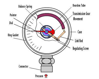 · Bourdon cső típusa: A nyomás növekedésével a Bourdon-cső fokozatosan kiegyenesedik (C-alakú cső esetén), vagy a belső nyomás miatt (spirális cső esetén) kibővül, az elmozdulás eredményeként.