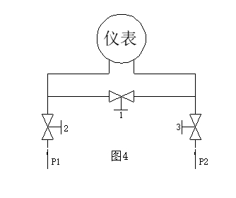 4. Ahogy az ábrán látható 4 , az egyensúly (biztonsági) szelep (szelep 1 ) be kell állítani a műszer magas és alacsony nyomású bemeneti portjait a telepítés során, és nyitott helyzetben kell lennie, és az egyensúlyszelepet a szelep után le kell zárni 2 és 3. szelep mind nyitva vannak.
